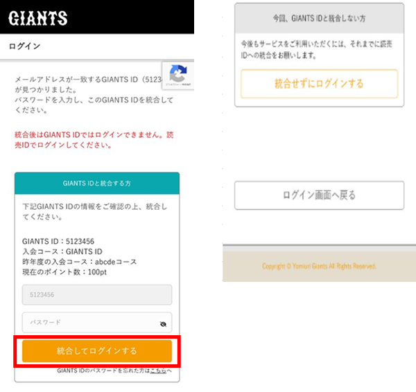 お持ちのGIANTS IDまたは登録メールアドレスとパスワードを入力し、「統合してログインする」をタップ