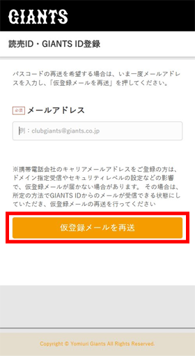 巨人軍のメールマガジン受信設定と規約に同意を行い、「GIANTS IDを新規作成してログインする」をタップ